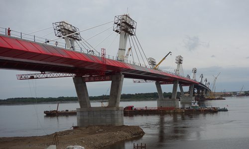 The first highway bridge between China and Russia is expected to open in October. With a length of 1,283 meters and a width of 14.7 meters, the bridge across the Heilongjiang River stretches from Heihe, a border city in Northeast China's Heilongjiang Province, to the Russian city of Blagoveshchensk. Photo: VCG
