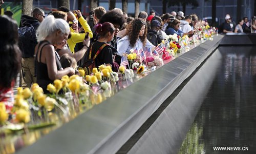 People stand beside plates on which the names of 9/11 victims were inscribed around the South Pool at the National September 11 Memorial and Museum in New York, the United States, on Sept 11, 2017. Photo: Xinhua
