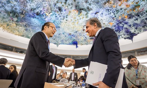Chinese Ambassador Chen Xu (left) greets Pakistani Foreign Minister Shah Mehmood Qureshi at the United Nations Human Rights Council on Tuesday in Geneva. Chen said during the opening ceremony of a human rights exhibition at the Palais des Nations that China has made great achievements in human rights in the past 70 years and is fully committed to multilateralism. Photo: AFP