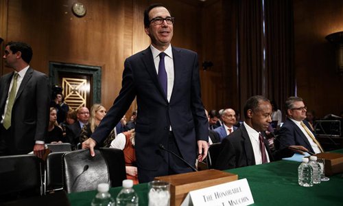 US Treasury Secretary Steven Mnuchin arrives for a Senate Banking, Housing, and Urban Affairs Committee hearing regarding housing finance reforms on Capitol Hill in Washington D.C., the United States, on Sept. 10, 2019. (Photo by Ting Shen/Xinhua)