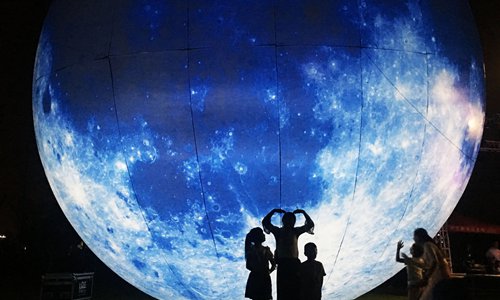 Pedestrians pose for photos with a moon installation set up to mark the Mid-Autumn Festival in Bozhou, east China's Anhui Province. (Xinhua/Ni Shubin)
