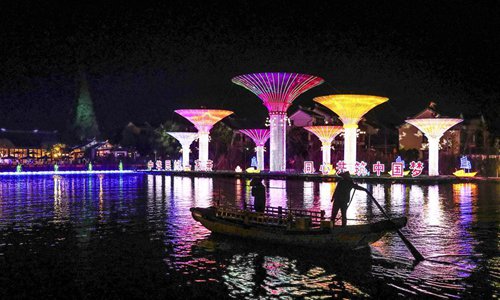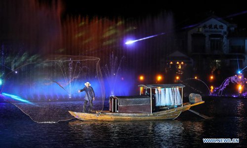 An actor performs on a vessel during a lighting ceremony of a lantern fair celebrating the Mid-Autumn Festival in Zhouzhuang Township of Kunshan City in east China's Jiangsu Province, Sept. 12, 2019. The lantern fair is held here from Sept. 12 to Oct. 8. (Xinhua/Yang Lei)