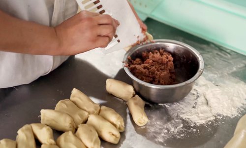 A baker is making mooncakes with synthetic meat. (Xinhua)