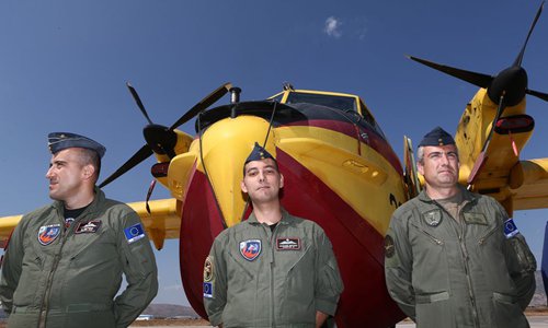 Fire-fighting aircraft pilots pose at Elefsina's airbase, near Athens, Greece. (Xinhua/Marios Lolos)