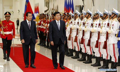 Cambodian Prime Minister Samdech Techo Hun Sen (2nd L) and visiting Lao Prime Minister Thongloun Sisoulith inspect the guard of honor in Phnom Penh, Cambodia, Sept. 12, 2019. The two prime ministers agreed on Thursday to resolve border dispute peacefully, according to a joint communique. Released after their bilateral meeting, the communique said the two leaders agreed to task the Joint Boundary Commission (JBC) of the two countries to jointly draft a treaty on the demarcation of the boundary between the two countries pertaining to the segments where both sides have completed the border demarcation amounting to 86 percent of the borderline. (Xinhua/Sovannara)