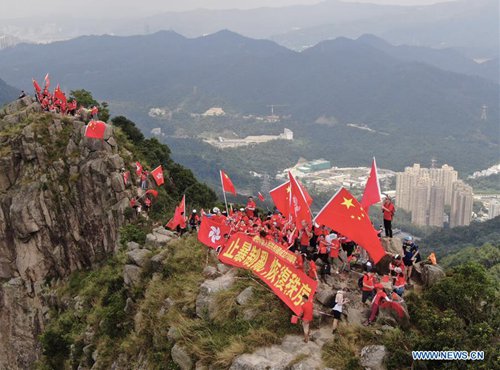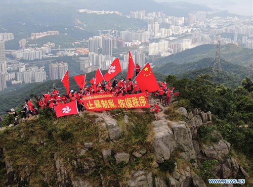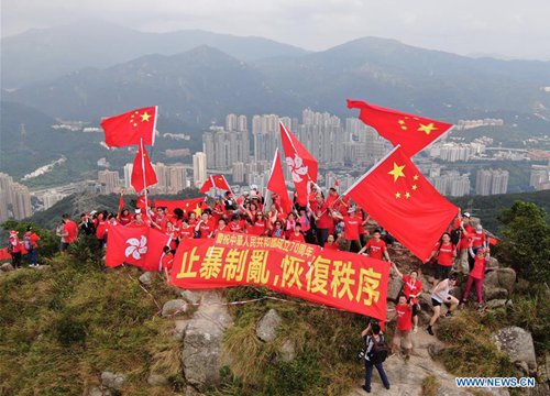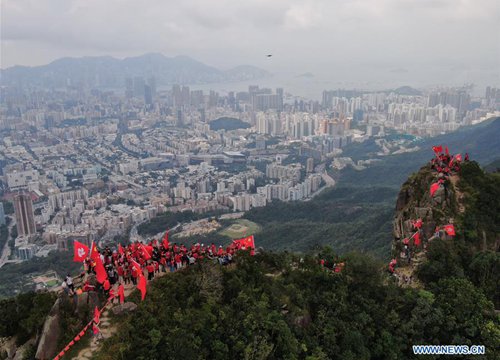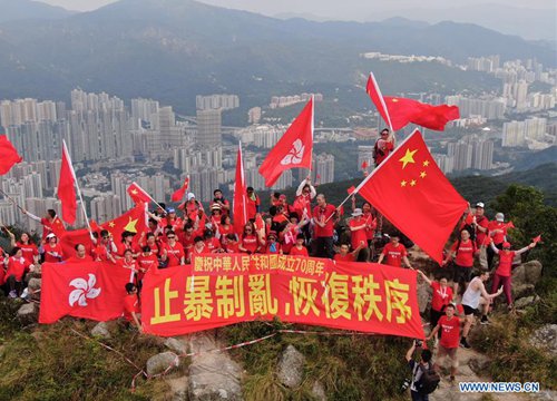 Residents wave China's national flag and the flag of the Hong Kong Special Administrative Region (SAR) at the peak of Lion Rock in Hong Kong, south China, Sept. 14, 2019. Over 100 Hong Kong residents waved the flags and held banners reading "Celebrating the 70th anniversary of the founding of the People's Republic of China" and "Stopping violence, ending the chaos and restoring order" here on Saturday. (Photo: Xinhua)