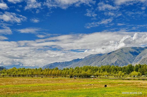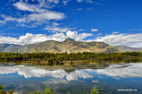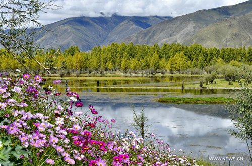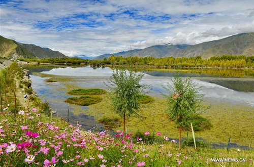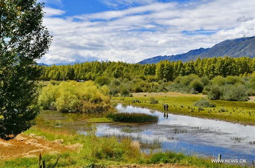 Photo taken on Sept. 14, 2019 shows the scenery at the Golden Pond Ecological Scenic Spot in Dagze District of Lhasa, southwest China's Tibet Autonomous Region. (Photo: Xinhua)