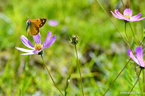 A butterfly lands on a flower in the Golden Pond Ecological Scenic Spot in Dagze District of Lhasa, southwest China's Tibet Autonomous Region, Sept. 14, 2019. (Photo: Xinhua)