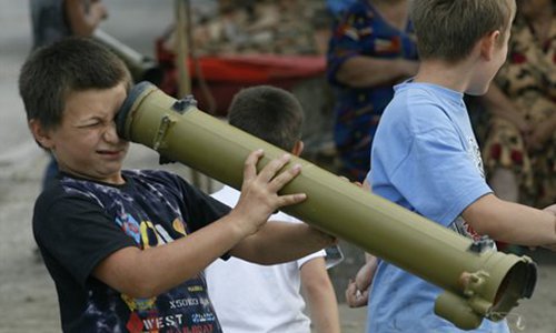Children play with an empty grenade launcher in Tskhinvali, Georgia in September 2008. Photo: CFP