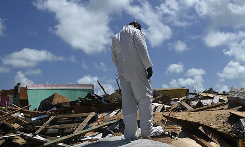 A member of the Bahamanian body recovery team looks on as he takes a break during a search operation in Marsh Harbour, Bahamas on Tuesday, one week after Hurricane Dorian. Bahamas authorities have updated the death toll from Hurricane Dorian to 50 with the number expected to climb, local media reported. Photo: AFP