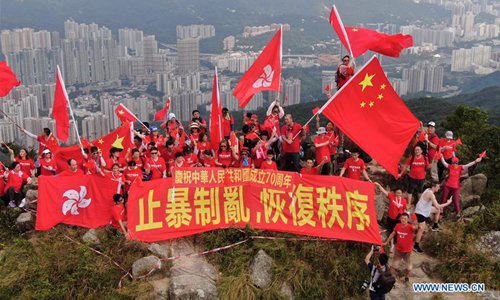 Residents wave China's national flag and the flag of the Hong Kong Special Administrative Region (SAR) at the peak of Lion Rock in Hong Kong, south China, Sept. 14, 2019. Over 100 Hong Kong residents waved the flags and held banners reading "Celebrating the 70th anniversary of the founding of the People's Republic of China" and "Stopping violence, ending the chaos and restoring order" here on Saturday. (Photo: Xinhua)