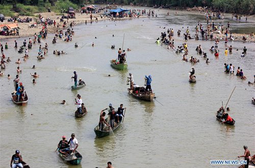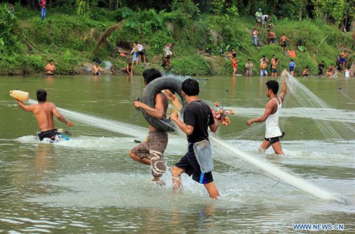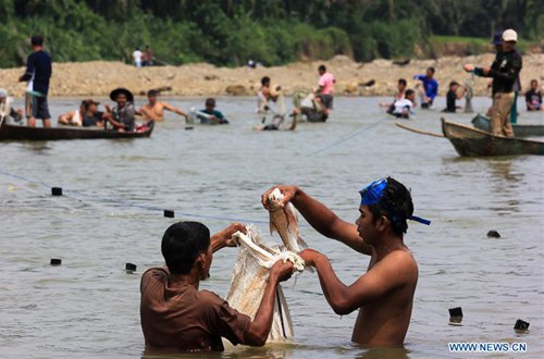 People catch fish during Ikan Larangan harvest festival at Nagari Aia Gadang, West Sumatra, Indonesia, Sept. 15, 2019. (Photo: Andri Mardiansyah/Xinhua)
