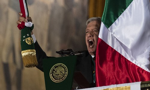 Mexican President Andres Manuel Lopez Obrador stands in the main balcony of the National Palace during the ceremony "The Shout" (El Grito) to mark the start of Independence Day celebrations in Mexico City on Sunday. The Mexican holiday is celebrated every September 16 with parades, feasts and festivals to honor the start of Mexico's War of Independence from Spain. Photo: AFP