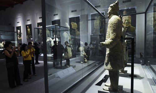Visitors look at Terracotta Warriors on display as part of China's First Emperor and the Terracotta Warriors exhibit at the Bangkok National Museum, Thailand on Sunday. Photo: VCG