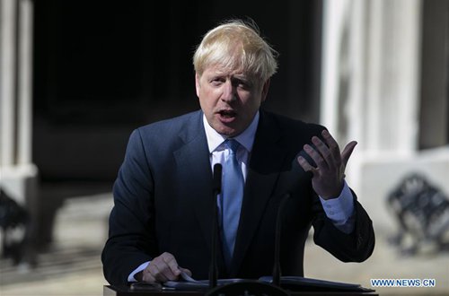 Newly elected Conservative Party leader and British Prime Minister Boris Johnson speaks at 10 Downing Street in London, Britain, July 24, 2019. Newly-elected Conservative Party leader Boris Johnson took office as the British prime minister on Wednesday amid the rising uncertainties of Brexit. The latest development came after Theresa May formally stepped down as the leader of the country and Johnson was invited by the Queen to form the government. (Photo: Xinhua)
