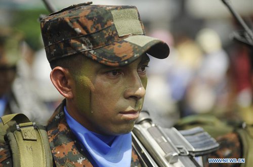 A soldier takes part in a celebration for the Independence Day of El Salvador in San Salvador, El Salvador, Sept. 15, 2019. (Photo: Alexander Pena/Xinhua)