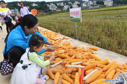 Photo taken on Sept.15, 2019 shows tourists trying to remove corn kernels from the cob during an event to celebrate harvest in Lugu Village in Qixing Township of Xundian Hui and Yi Autonomous County, southwest China's Yunnan Province. (Photo: Xinhua)
