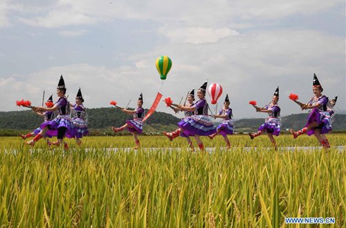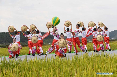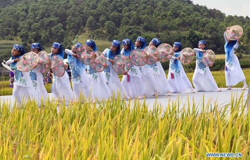 Photo taken on Sept.15, 2019 shows people dancing in fields to celebrate harvest in Lugu Village in Qixing Township of Xundian Hui and Yi Autonomous County, southwest China's Yunnan Province. (Photo: Xinhua)