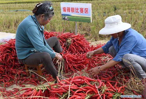 Women string red peppers during a contest to celebrate harvest at Lugu Village in Qixing Township of Xundian Hui and Yi Autonomous County, southwest China's Yunnan Province, Sept.15, 2019. (Photo: Xinhua)