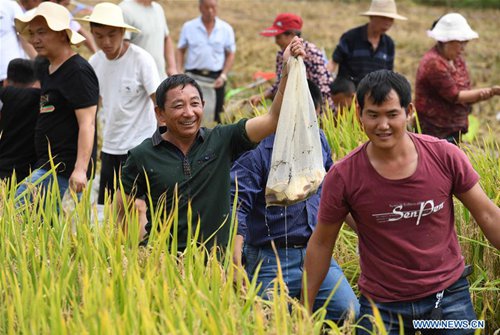 People attend a fish-catching contest to celebrate harvest at Lugu Village in Qixing Township of Xundian Hui and Yi Autonomous County, southwest China's Yunnan Province, Sept.15, 2019. (Photo: Xinhua)