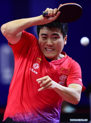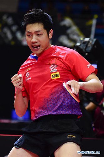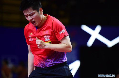 Xu Xin of China celebrates scoring against Jang Woojin of South Korea during the men's teams final between China and South Korea at the 2019 Asian Table Tennis Championship in Yogyakarta, Indonesia, Sept. 18, 2019. (Photo: Xinhua)