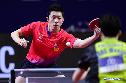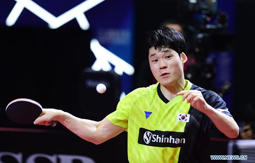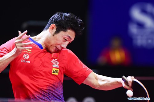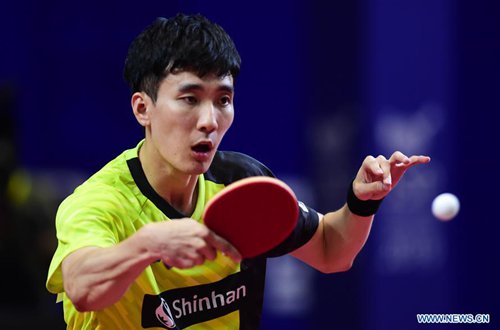 Jang Woojin of South Korea returns the ball to Xu Xin of China during the men's teams final between China and South Korea at the 2019 Asian Table Tennis Championship in Yogyakarta, Indonesia, Sept. 18, 2019. (Photo: Xinhua)