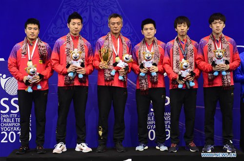 Players of China pose for photo during the awarding ceremony after men's teams final between China and South Korea at the 2019 Asian Table Tennis Championship in Yogyakarta, Indonesia, Sept. 18, 2019. (Photo: Xinhua)