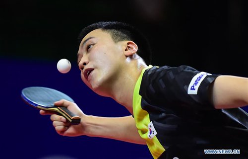 Fan Zhendong of China returns the ball to Jeoung Youngsik of South Korea during the men's teams final between China and South Korea at the 2019 Asian Table Tennis Championship in Yogyakarta, Indonesia, Sept. 18, 2019. (Photo: Xinhua)