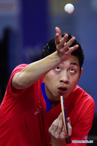 Xu Xin of China serves the ball to Jang Woojin of South Korea during the men's teams final between China and South Korea at the 2019 Asian Table Tennis Championship in Yogyakarta, Indonesia, Sept. 18, 2019. (Photo: Xinhua)