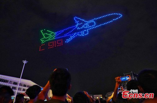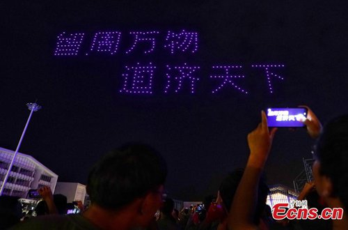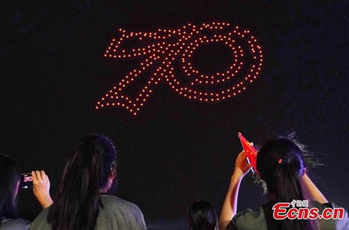 Photo taken on Sept. 17, 2019 shows a drone display at the Tianmu Lake Campus of Nanjing University of Aeronautics and Astronautics in Nanjing, Jiangsu Province as part of celebrations to mark the 70th anniversary of the founding of the People’s Republic of China. As music played, 300 drones took off to form Chinese characters such as Love China or iconic patterns including Tiananmen. (Photo: China News Service/Yang Bo) Photo taken on Sept. 17, 2019 shows a drone display at the Tianmu Lake Campus of Nanjing University of Aeronautics and Astronautics in Nanjing, Jiangsu Province as part of celebrations to mark the 70th anniversary of the founding of the People’s Republic of China. As music played, 300 drones took off to form Chinese characters such as Love China or iconic patterns including Tiananmen. (Photo: China News Service)