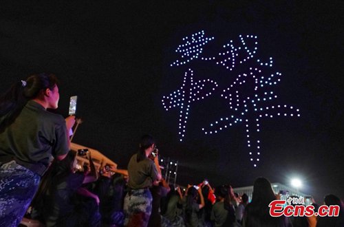 Photo taken on Sept. 17, 2019 shows a drone display at the Tianmu Lake Campus of Nanjing University of Aeronautics and Astronautics in Nanjing, Jiangsu Province as part of celebrations to mark the 70th anniversary of the founding of the People’s Republic of China. As music played, 300 drones took off to form Chinese characters such as Love China or iconic patterns including Tiananmen. (Photo: Ecns.cn)