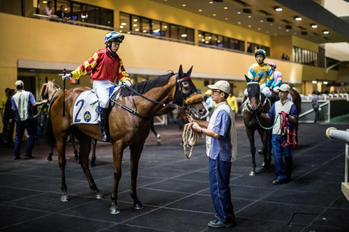 In this picture taken on March 31, 2016, jockeys gather near the paddock on their horses between night horse races at the Hong Kong Jockey Club in the Happy Valley district of Hong Kong. Photo:VCG