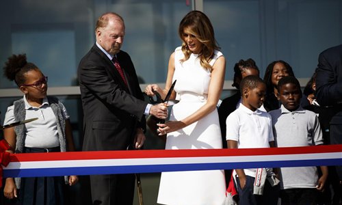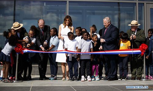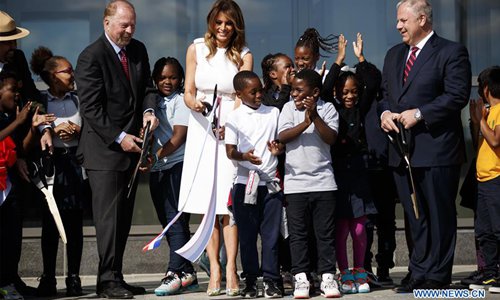 US first lady Melania Trump cuts the ribbon during the reopening ceremony of the Washington Monument in Washington D.C., the United States, on Sept. 19, 2019. US first lady Melania Trump, alongside a group of local elementary school students, helped cut the ribbon to reopen the Washington Monument on Thursday. The 555-foot tall marble obelisk, named for the nation's first president, now has an upgrade elevator and a new permanent screening facility after years of renovations, according to the National Park Service. (Photo by Ting Shen/Xinhua)