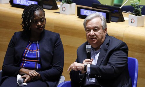 United Nations Secretary-General Antonio Guterres (R) speaks during the UN Youth Climate Summit at the UN headquarters in New York, Sept. 21, 2019. UN Secretary-General Antonio Guterres on Saturday said he saw a change in the momentum of global climate action thanks to the ongoing youth movement. (Xinhua/Li Muzi)