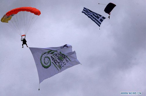Parachutes are seen during the air show at the Tanagra Air Base, north of Athens, Greece, on Sept. 21, 2019. Greece's largest air show, the Athens Flying Week (AFW) Tanagra International Air Show 2019, took off Saturday for its 8th consecutive year at Tanagra Air Base, about 70 kilometers northwest of Athens. (Photo: Xinhua)