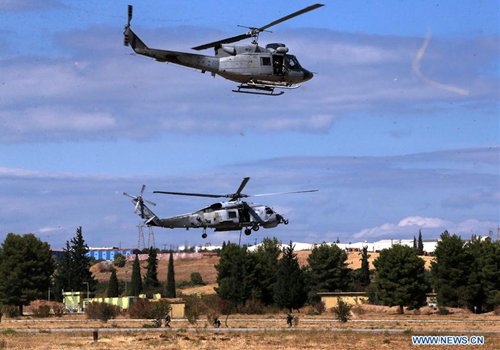 Two Greek Air Force helicopters perform during the air show at the Tanagra Air Base, north of Athens, Greece, on Sept. 21, 2019. Greece's largest air show, the Athens Flying Week (AFW) Tanagra International Air Show 2019, took off Saturday for its 8th consecutive year at Tanagra Air Base, about 70 kilometers northwest of Athens. (Photo: Xinhua)