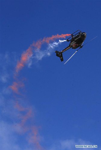 A helicopter performs during the air show at the Tanagra Air Base, north of Athens, Greece, on Sept. 21, 2019. Greece's largest air show, the Athens Flying Week (AFW) Tanagra International Air Show 2019, took off Saturday for its 8th consecutive year at Tanagra Air Base, about 70 kilometers northwest of Athens. (Photo: Xinhua)