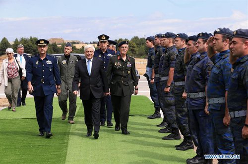 Greek President Prokopis Pavlopoulos (C, front) arrives at the Tanagra Air Base, north of Athens, Greece, on Sept. 21, 2019. Greece's largest air show, the Athens Flying Week (AFW) Tanagra International Air Show 2019, took off Saturday for its 8th consecutive year at Tanagra Air Base, about 70 kilometers northwest of Athens. (Photo: Xinhua)