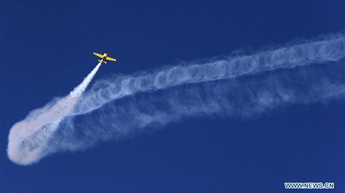 An aircraft performs during the air show at the Tanagra Air Base, north of Athens, Greece, on Sept. 21, 2019. Greece's largest air show, the Athens Flying Week (AFW) Tanagra International Air Show 2019, took off Saturday for its 8th consecutive year at Tanagra Air Base, about 70 kilometers northwest of Athens. (Photo: Xinhua)