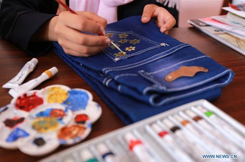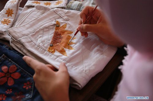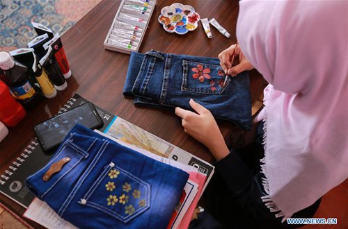 Palestinian artist Manal Al-Astal paints on jeans inside her house in the southern Gaza Strip city of Khan Younis, Sept. 19, 2019. (Photo: Mohammed Dahman/Xinhua)