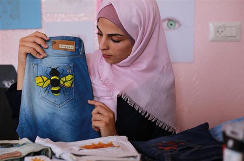 Palestinian artist Manal Al-Astal shows her paints on jeans inside her house in the southern Gaza Strip city of Khan Younis, Sept. 19, 2019. (Photo: Mohammed Dahman/Xinhua)