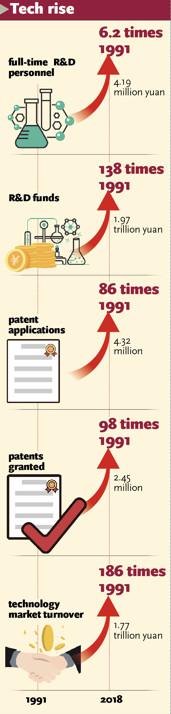 China's investment in R&D has continued to grow rapidly, reaching 1.97 trillion yuan in 2018, 138 times 1991's figure. The average annual growth rate from 1992 to 2018 was 20 percent, exceeding the annualized growth rate of GDP calculated at current prices in the same period, according to a July NBS report.