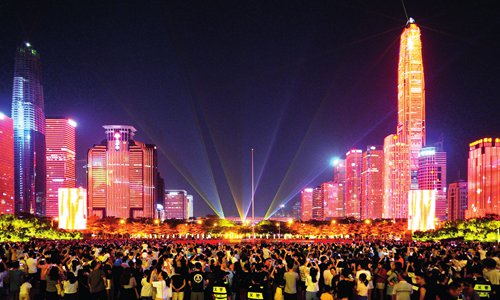 The Chinese flag, seen on a building in the city center of Shenzhen, South China's Guangdong Province, during a celebration of the 70th anniversary of the founding of the People's Republic of China on Monday Photo: VCG