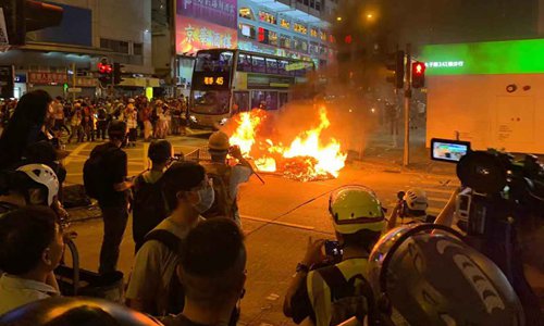 Rioters set fire in Mong Kok on Sunday. Photo: Zhao Juecheng and Lu Wenao/GT