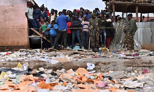 Relatives wait outside a security perimeter set up near the area of a collapsed school building on Monday in Nairobi, Kenya. Seven children died and scores were injured early Monday when a school building collapsed in the Kenyan capital in an accident blamed on shoddy construction. Photo: AFP