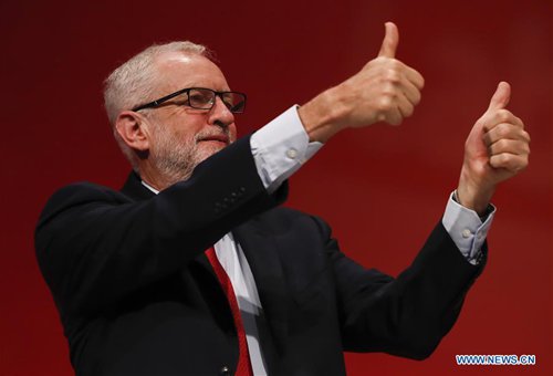 British Labour Party Leader Jeremy Corbyn gestures at the Labour Party Annual Conference 2019 in Brighton, Britain, Sept. 23, 2019. (Photo: Xinhua)