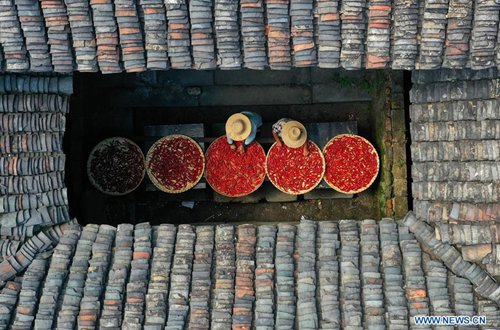 Aerial photo taken on Sept. 22, 2019 shows villagers drying chili peppers at Xiachong Village of Luoqiao Town in Changning City, central China's Hunan Province. Farmers across the country celebrate the Chinese farmers' harvest festival, which falls on the Autumn Equinox, or Sept. 23 this year. (Photo: Cao Zhengping/Xinhua)