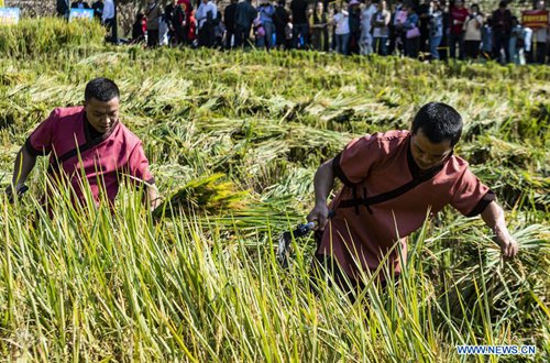 A farmer participates in a competition on rice harvesting at Jiuwanxi Town of Zigui County, central China's Hubei Province, Sept. 23, 2019. Farmers across the country celebrate the Chinese farmers' harvest festival, which falls on the Autumn Equinox, or Sept. 23 this year. (Photo: Xiang Hongmei/Xinhua)
