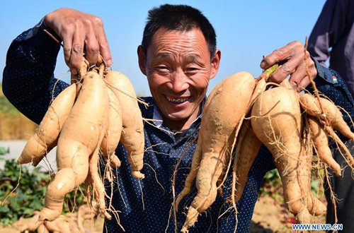 A farmer displays sweet potatoes at Liuquan Village of Dianzi Town in Zaozhuang City, east China's Shandong Province, Sept. 22, 2019. Farmers across the country celebrate the Chinese farmers' harvest festival, which falls on the Autumn Equinox, or Sept. 23 this year. (Photo: Liu Mingxiang/Xinhua)