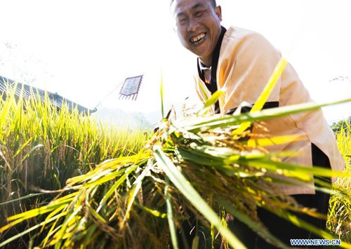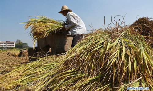 A villager harvests paddy rice at Dashitang Village of Wuji Town in Hengdong County, central China's Hunan Province, Sept. 22, 2019. Farmers across the country celebrate the Chinese farmers' harvest festival, which falls on the Autumn Equinox, or Sept. 23 this year. (Photo: Xiao Yahui/Xinhua)